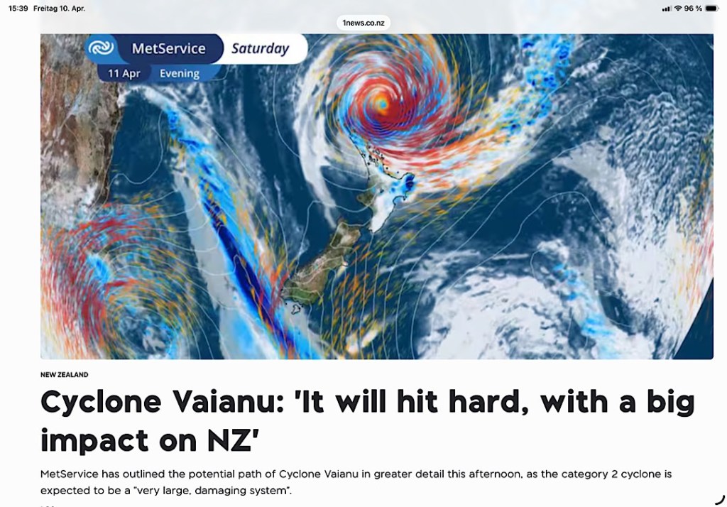 Wie damals Gabrielle war jetzt auch Vaianu zwischenzeitlich ein Zyklon der Kategorie drei. Zum Glück für die tropischen Inselgruppen ging er zwischen Vanuatu und Fiji hindurch, Landfall wird Vaianu dann Samstag/Sonntag (hoffentlich schon deutlich abgeschwächt) in Neuseeland machen.