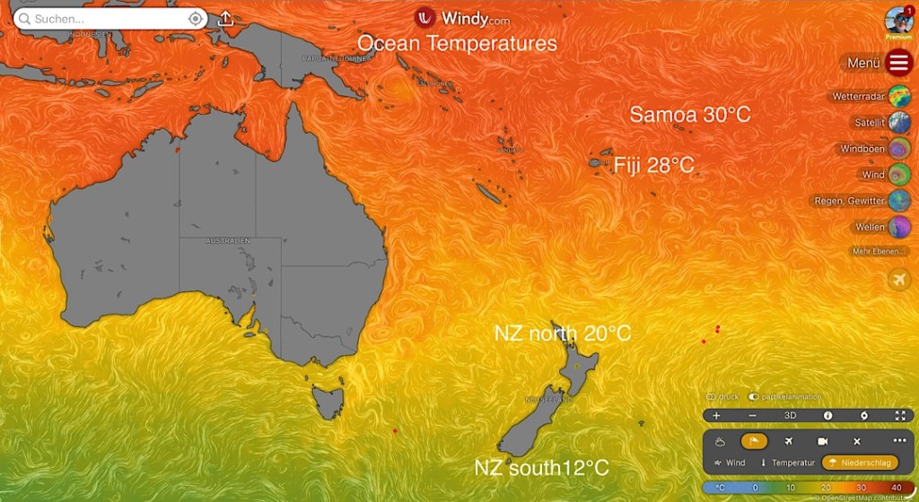 Jetzt im Südhalbkugel-Herbst (wo der April dem Oktober der Nordhalbkugel entspricht) ist das Wasser um Neuseeland herum nicht mehr ganz so warm, insbesondere im Süden.