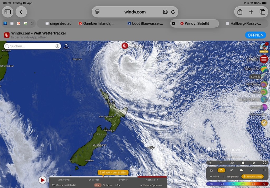 In Orkanstärke bläst Vaianu daher schon jetzt nicht mehr. Wirklich entspannen kann Neuseeland deswegen aber noch nicht. Zu groß, zu mächtig ist das System noch. Mehr als deutlich wird das auf den aktuellen Satellelitenaufnahmen:
