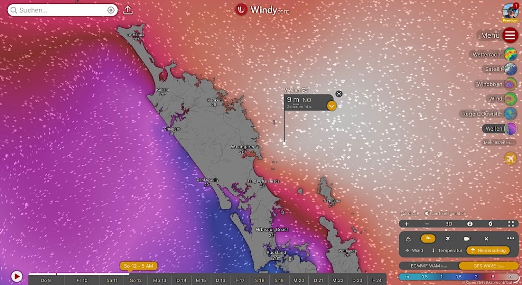 Und noch immer schiebt der Sturmwirbel Wassermassen vor sich her, die sich zur Höhe dreistöckiger Gebäude auftürmen. Für die Küste vor Whangārei werden bis zu 9 m hohe Wellen vorhergesagt.