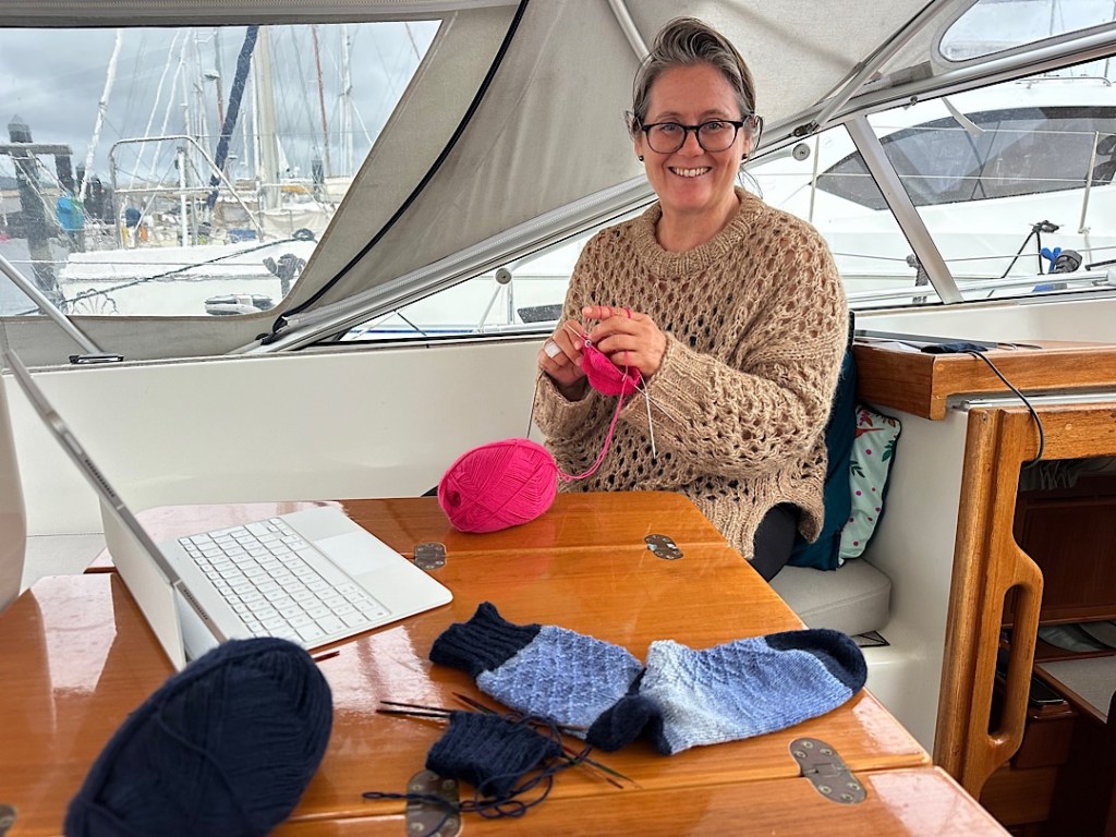 Und … warme Socken stricken, weil der Wind über Süd herumdrehen und kalte Luft hier heraufschaufeln wird. Ganz klassisch, Wiebke strickt rosa Socken, ich blaue.
