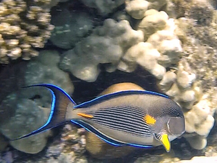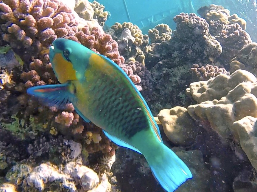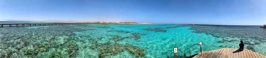 Wir sind zurück aus Ägypten, zurück aus der Wüstenwelt über Wasser und der Paradieswelt darunter, die sich schon vom Steg aus erahnen lässt.