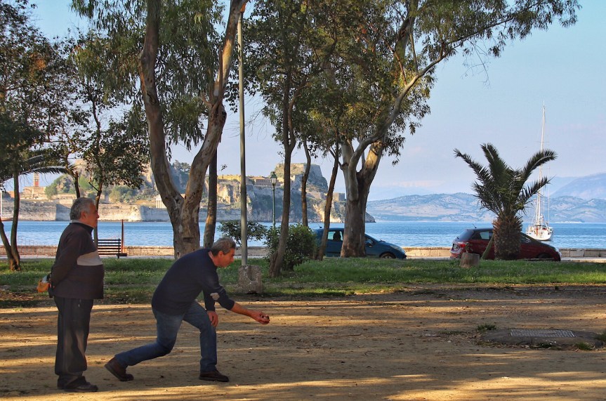 Also Landgang auf dem der Innenstadt und der Festung gegenüber gelegenen Ufer der halbkreisförmigen Bucht. Wir werden verwöhnt mit einem wunderschönen kleinen Park, in dem klare Geschlechtertrennung zu erkennen ist. An mehreren Stellen spielen griechische Männer Boule unter alten Platanen, Frauen und Kinder sind auf den eingezäunten Spielplätzen zu finden. Und wir haben schöne Ausblicke auf Flora vor der Festung und der Stadt.