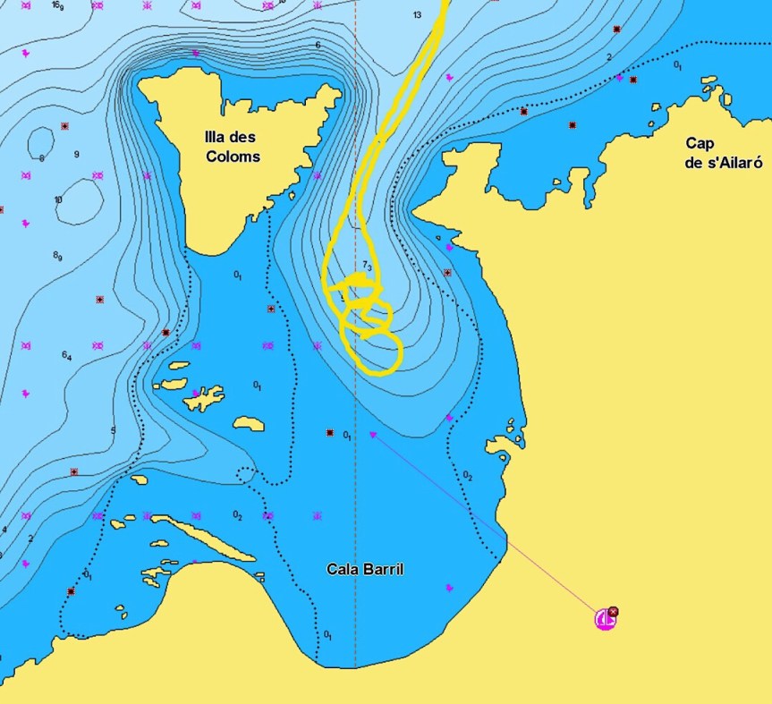 Und auch am folgenden Tag dauerte es nicht lange bis zum Badestop: wir wählten die sehr kleine, felsumstandene Cala Barril. Hier unser Plot auf der Navionics-Karte: