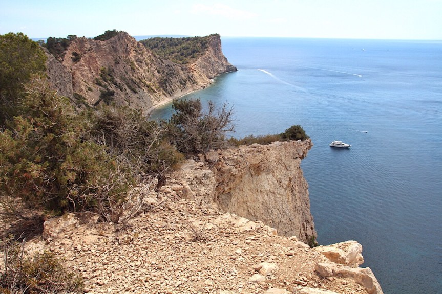 Heute ist dann Catalina vom Strand mit dem Taxi zum nahen Flughafen gefahren. Wir haben nur um die Ecke in die nächste Bucht verholt – was für ein Unterschied. Kaum Schiffe hier, eine beeindruckende Steilküste auf der einen Seite und nur eine Strandbar oberhalb des flachen Steinstrandes vor den Salinen im Scheitel der großen Bucht.
