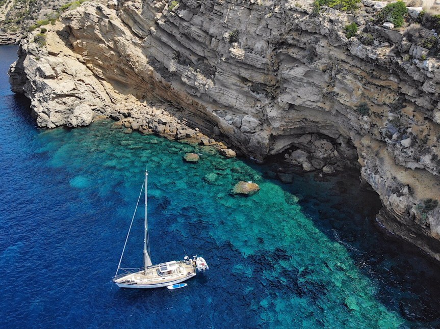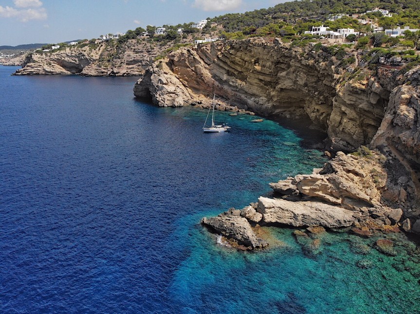 Buchtenbummeln. Die Entfernungen zwischen den Calas oder Ensenadas (=Buchten) sind an Ibizas Westküste so gering, dass wir uns manchmal überwinden müssen, überhaupt die Segel hochzunehmen und das kurze Stück bis zum nächsten Ankerplatz nicht einfach zu motoren.