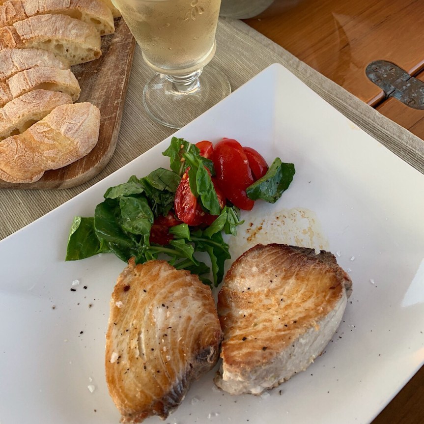 Aber grundsätzlich kochen wir frisch. In Catania hat uns z.B. ein netter Franzose selbstgefangenen Thunfisch geschenkt. Also geschenkt oder selbst gefangen: Ab in die Pfanne, etwas Salat dazu, fertig.