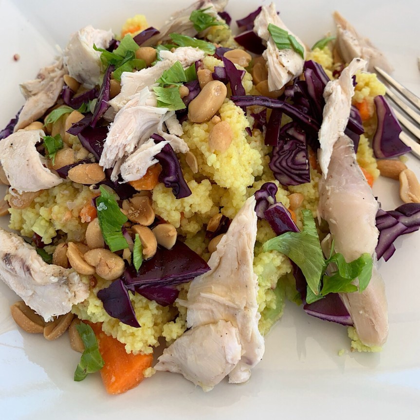 Vor Nachtfahrten und längeren Törns bereite ich ein, zwei Sachen vor, so dass wir sie unterwegs nur aufwärmen können und nicht lange unter Deck schnippel müssen. Für die Überfahrt von Sizilien nach Sardinien gab es Kartoffel-Tomaten-Paprika-Suppe und einen Couscous-Salat mit Möhren, Staudensellerie, Rotkohl, Erdnüssen und Hühnchen.