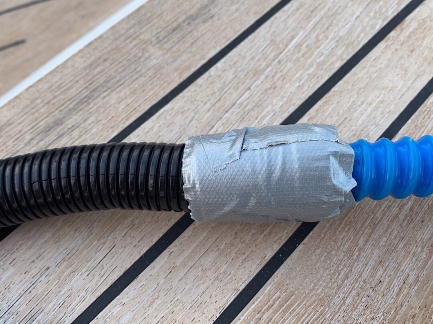 Oder das Dinghy vom gesammelten Sand (auch unter den Bodenbrettern) befreien, also Luft ablassen, spülen, wieder aufpumpen. Doof allerdings, wenn dabei die Pumpe den Geist aufgibt. Aber mit etwas Ducktape und der eigentlich unpassenden SUP-Pumpe lässt sich auch hier ein Workaround finden 😉.