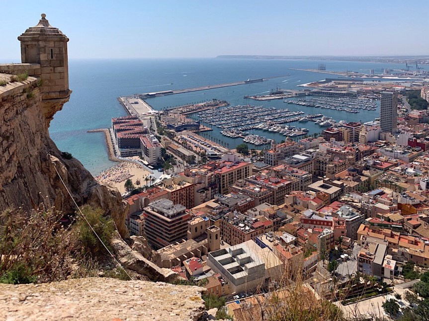 haben ein spezielles Reisrestaurant dieser für ihre Reisgerichte bekannten Stadt besucht (lecker!), haben Tapas-Bars und in Ihnen zu den Leckereien mal Bier, mal Tinto de Verano genossen. Letzteres ist gekühlter Rotwein mit Zitronenlimo und schmeckt bei der Wärme hier VIEL besser, als es sich anhört. Und klar haben wir auch die hoch über Alicante aufragende Festung Castillo de Santa Barbara besichtigt, mit tollen Ausblicken über die Stadt und hinüber über die Bucht bis nach Sant Joan, wobei uns ein Aufzug für nur 2,70 € vom Strand aus hinauf befördert hat, die Festung selbst kann frei betreten werden.