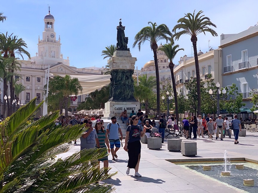 Die Begrüßung in Cádiz ist für einen Hamburger klasse: schon von weitem scheint die große Schwester der Köhlbrandbrücke zu grüßen. Die „Puente de la Constitutión“ ist eine ganz ähnlich konstruierte Schrägseilbrücke und führt ebenfalls durch sich öffnende Tragstützen. Etwas höher als in Hamburg, dafür ein tickchen kürzer, können wir sie schon aus großer Entfernung sehen und ihr Anblick bietet sich auch noch von unserem Liegeplatz in der Marina Puerto América. Und – wie in HH – sind auch hier die Kreuzfahrtschiffe reichlich vertreten. Gleich vier haben im Stadthafen festgemacht, darunter eine AIDA und die „Mein Schiff 2“. Wir hören viel Deutsch in der wunderschönen Altstadt 😉.