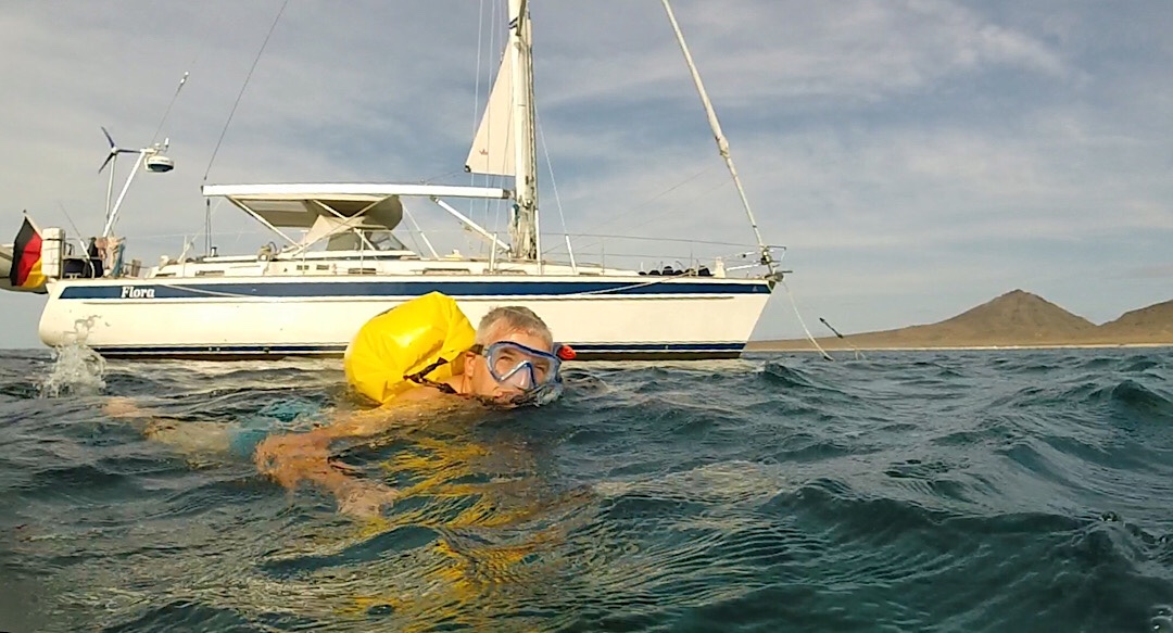 Also bleibt nur, FREIWILLIG Baden und an Land zu schwimmen. Kamera, Handtuch und trockene Klamotten kommen in einen Drybag (*3), Flossen und Taucherbrille an und dann los.
