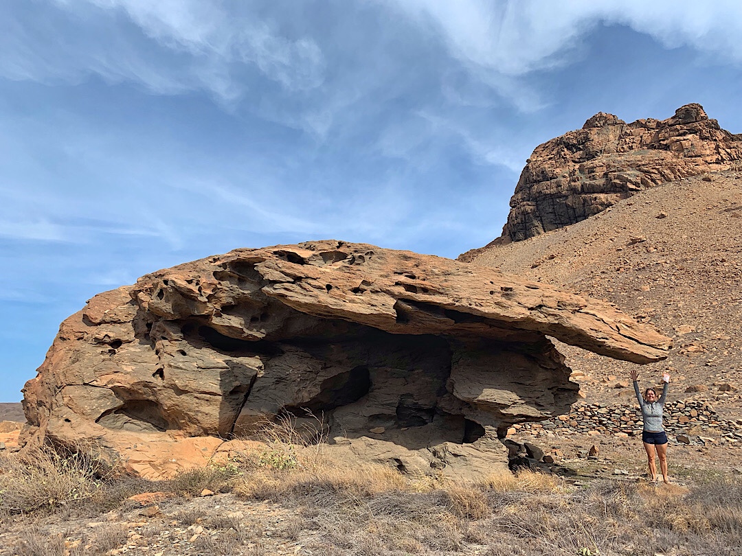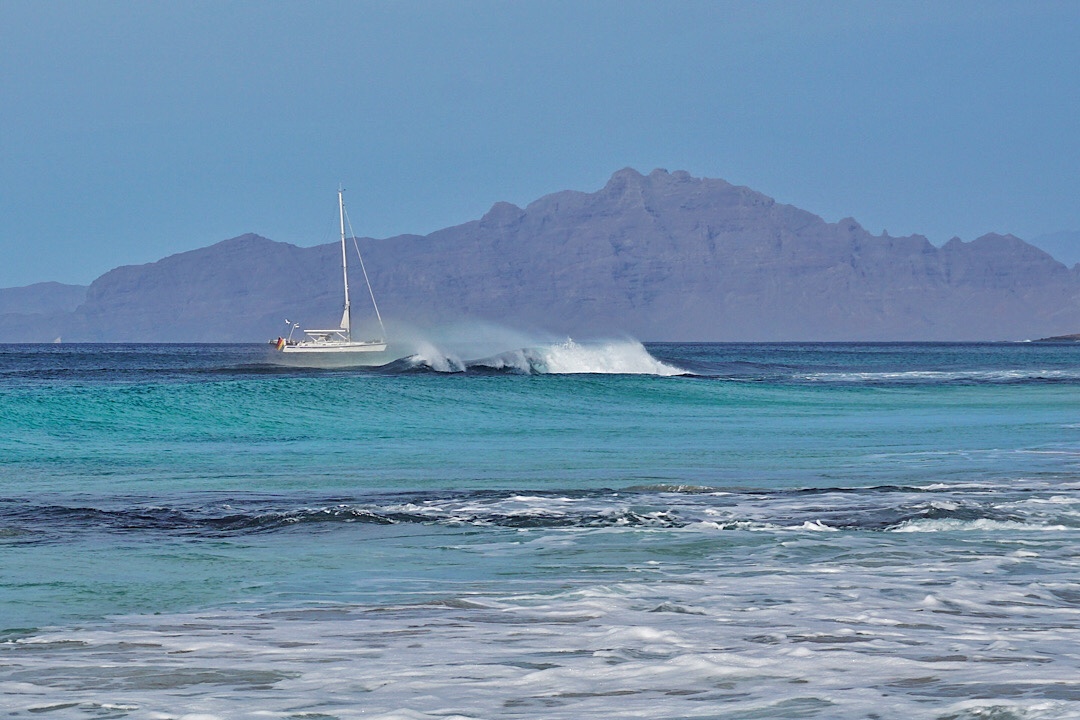 tatsächlich aber vor der Südwestseite der unbewohnten Insel Santa Luzia. Gegenüber des kleinen Felseninselchens Ilhéu Zinho zieht sich ein breiter, wunderbar feinsandiger Strand die ganze Bucht entlang. Als wir ankommen, liegt nur ein einziges weiteres Boot in der Bucht, kurz vor Sonnenuntergang kommt ein drittes hinzu. Beide sind am nächsten Morgen schon früh wieder verschwunden. Wir aber bleiben, haben wir uns doch einen Landgang auf der Insel vorgenommen. Santa Luzia macht das dem Besucher allerdings nicht leicht: obwohl der Strand in Lee (*1) der Insel gelegen ist, blasen hier fortwährend Williwaws (*2) aus den Tälern heraus. Zudem gibt sich die See zwar ruhig und wir rollen auch nicht übermäßig vor Anker, aber die Dünung brandet trotzdem in beeindruckenden Wellen auf den Strand. Das Dinghy würde bei diesen Wellen große Gefahr laufen umzukippen. Nicht nur dass wir dann unfreiwillig baden würden, der Außenbordmotor des Beibootes mag solche Taucheinheiten gar nicht.