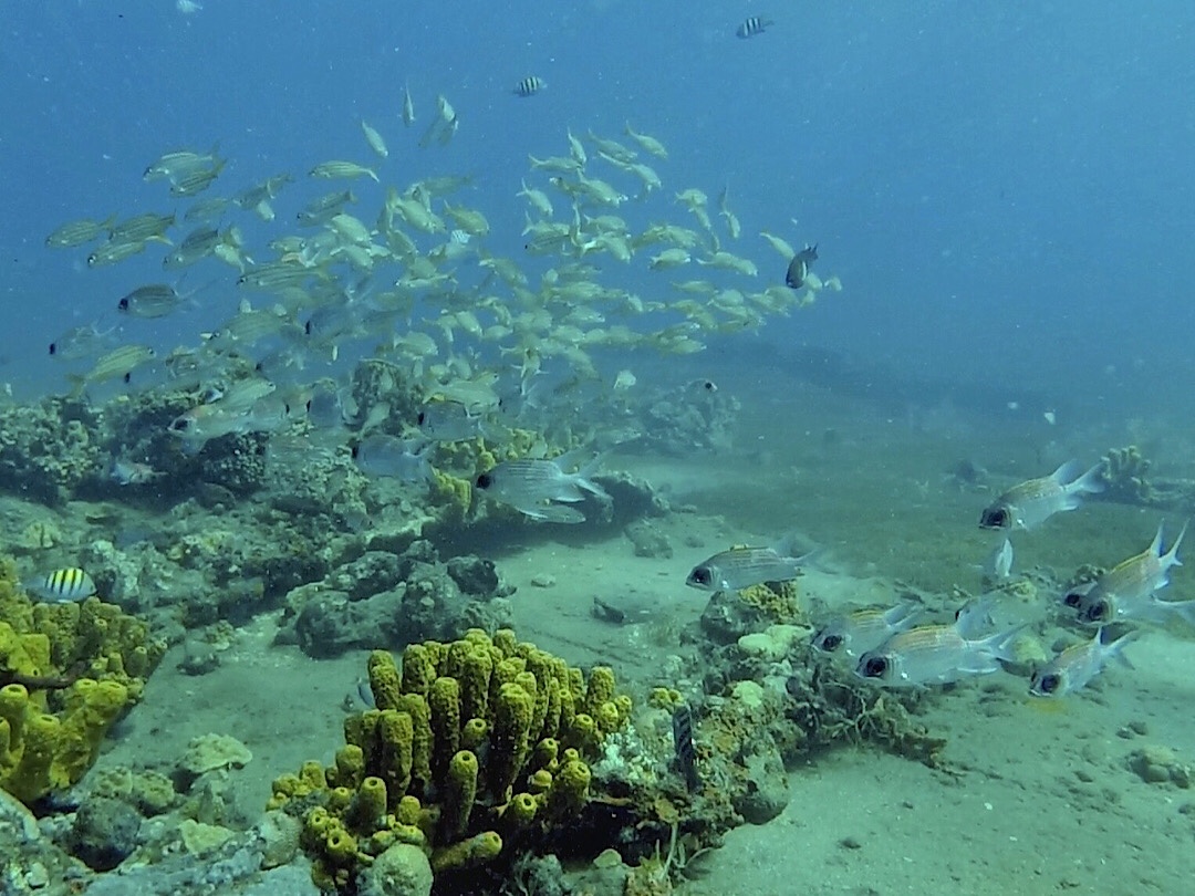Wir suchen uns eine Stelle in der etwas südlich gelegenen Anse Turin, wo mit Bojen markiert ebenfalls eine Ankerverbotszone um einige kleinere, in nur 6 bis 7 m Tiefe liegende Wracks ausgewiesen ist. Gemeinsam mit Ingo von der Easy One und Guido von der Imperia gehen wir dort vom Dinghy aus auf Tauchgang. Von der Wracks ist nicht mehr allzu viel übrig (eigentlich sind es Wracks von Wracks 😉), aber auf den Trümmern haben sich Schwämme, Korallen und Anemonen angesiedelt und viele Fische nutzen den Schutz.