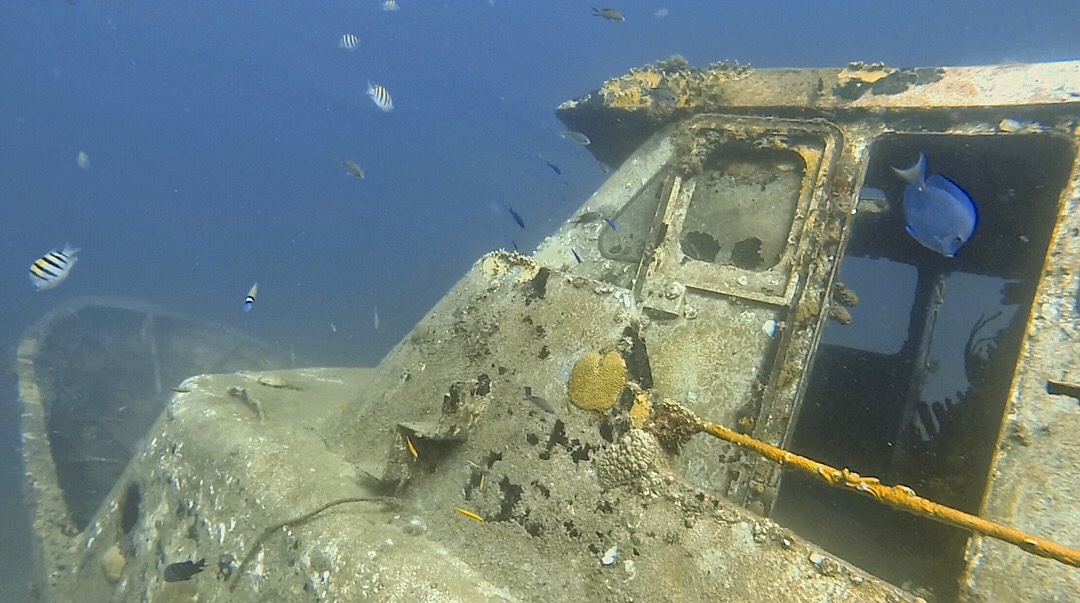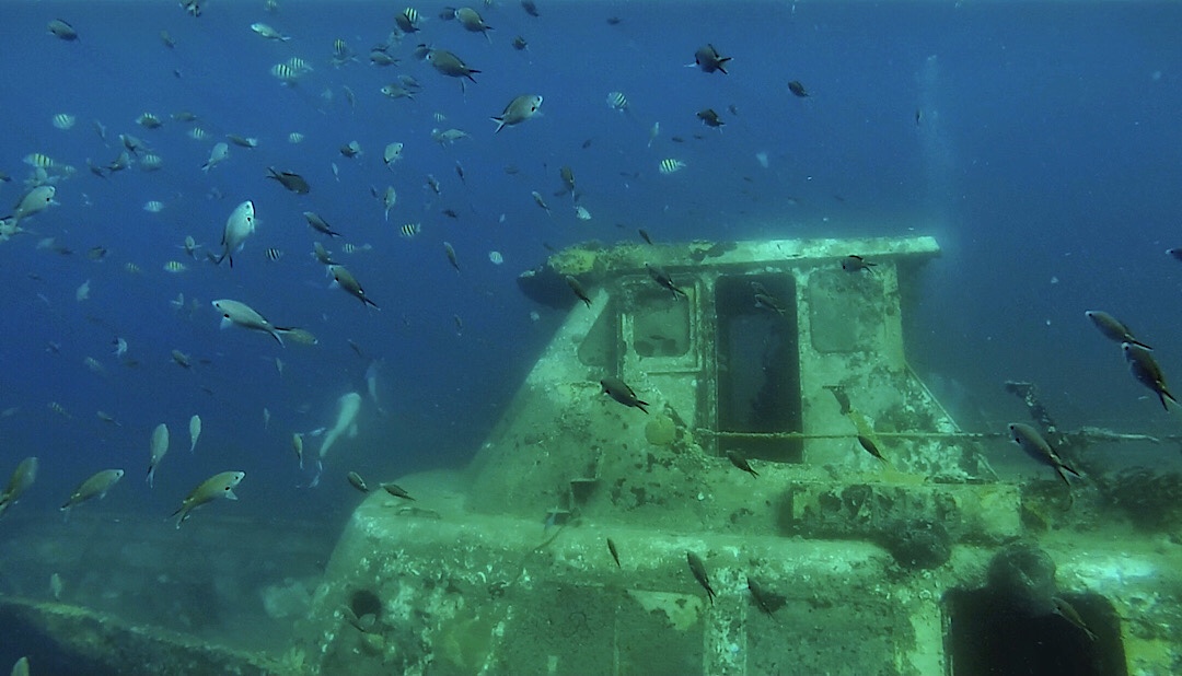 Es ist die ehemalige Fähre Lynndy, die – wenn man den spärlichen Informationen glauben kann – nach einem tropischen Sturm 2006 sank. Das Wrack ruht fast aufrecht auf seinem Kiel und über der Oberkante des Aufbaus ist das Wasser deshalb nur etwa vier Meter tief, perfekt zum Schnorcheln.