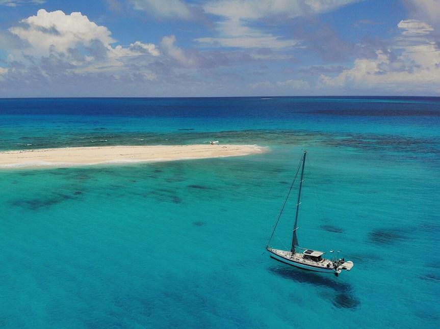 Trotz gut 1 m hoher See können wir die Brandung auf dem Riff erst spät erkennen. Unser Tiefenmesser zeigt da noch drei Striche an – das Echolot kann keinen Grund finden. Erst etwa 100 m vor der Einfahrt ändert sich das, der Grund steigt rapide an und wir ankern in Lee des Sandfleckchens Northwest Cay auf 5 m Wassertiefe über Sand. In die Lagune einzufahren verwerfen wir. Zwar reicht die Tiefe aus, aber die überall verstreuten Korallenköpfe können wir jetzt am Morgen noch nicht gut erkennen, weil wir die Sonne nicht im Rücken haben und sie noch nicht sehr hoch steht. Außerdem baut sich in der großen Lagune bei den 14 kn Wind doch schon wieder eine spürbare Windsee auf.