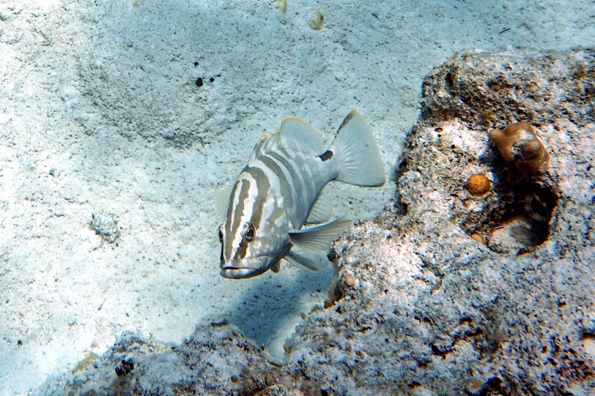 Außerdem gibt es in der Bucht noch ein vom Boot aus gut schnorchelnd zu erreichendes Riff, wo wir neben vielen anderen Fischen z.B. einen imposanten Nassau-Zackenbarsch und mehrere bunte Königin-Drückerfische vor die Linse bekommen.