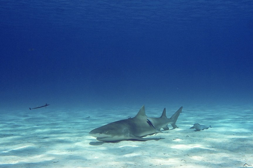 Einmal erspähen wir sogar zwei Zitronenhaie (die werden etwa gut 3 m lang) und einen Ammenhai (wird über 4 m lang) gleichzeitig, aber vor die Kamera kriegen wir sie bisher nur einzeln. Wir schätzen, das die von uns gesehenen Exemplare noch nicht ganz ausgewachsen waren (vielleicht jeweils etwa einen Meter kürzer).