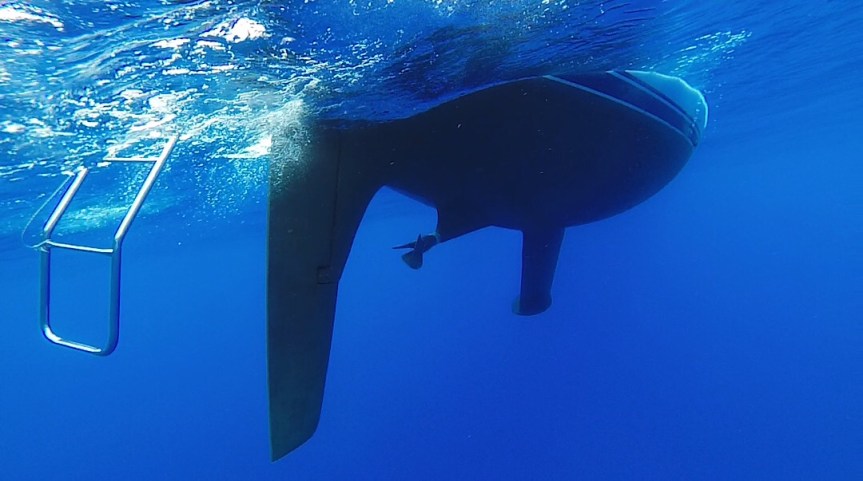 Irgendwann stellen wir den Motor mal ab und nehmen ein Bad in dem dunklen Blau des hier wohl etwa 2.000 m tiefen Wasser. Schon ein komisches Gefühl, aber auch wunderschön, insbesondere weil kurz mal die Sonne durchblitzt und dem kräftigen Blau ein ganz besonderes Strahlen verleiht.