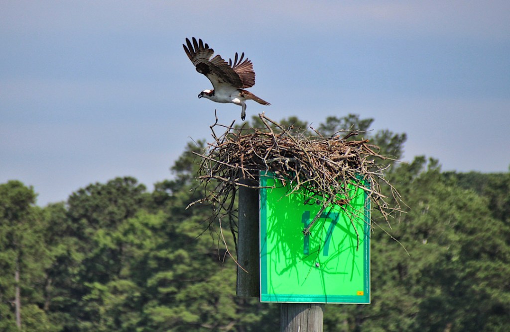 Langsam pöttern wir durch die Parklandschaft zurück, wie auf der Hinfahrt sehen wir mehrfach Fischadler. Die majestätischen Vögel sind mit einer Flügelspannweite von etwa 1,7 m zwar etwas kleiner als die Weißkopfseeadler (bis 2,3 m und amerikanische Wappentiere), aber dafür brüten die Fischadler gerne auf den Seezeichen hier und präsentieren sich uns damit ganz aus der Nähe.