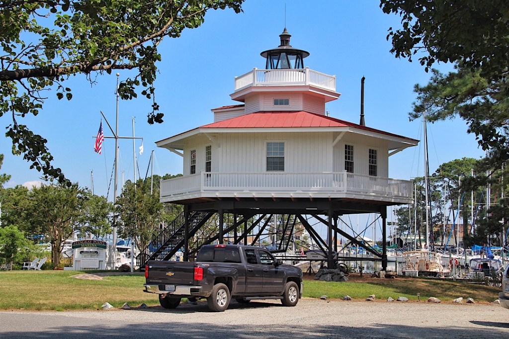 Es riecht nach Sommer und wir erkunden auf unserer Fahrradtour einen größeren Teil der Landspitze mit ihren verschiedenen Häfen. In der Stingray Point Marina stoßen wir auf einen kompletten 1:1 Nachbau des alten Leuchtturms von 1853, der damals das ausgedehnte Flach vor dieser Halbinsel zwischen den Flüssen markierte und der sich so deutlich von den klassischen europäischen Leuchttürmen unterscheidet, Ähnliche Leuchtürme fanden – und finden – sich in der Chesapeake Bay aber noch mehrere.