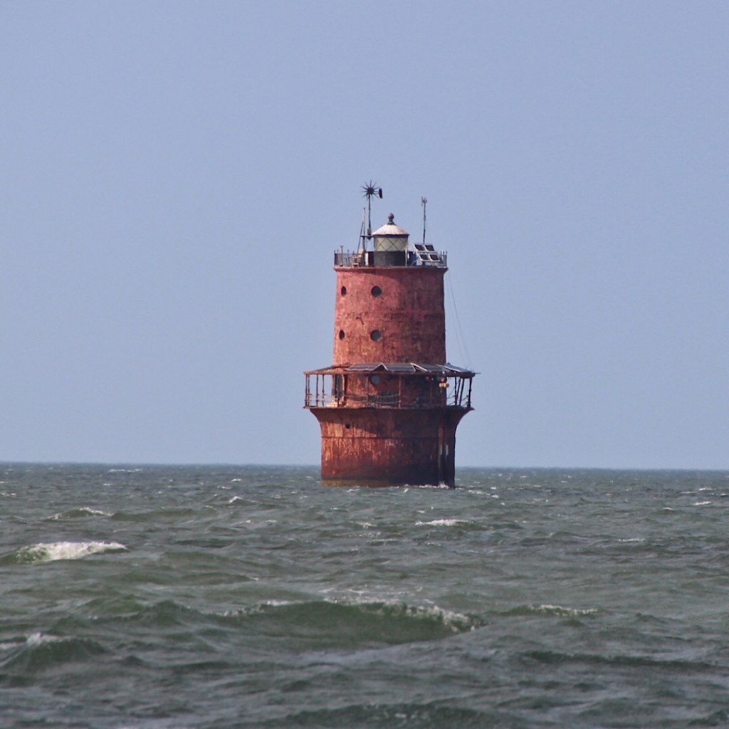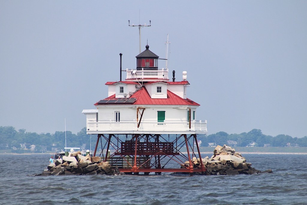 „Wolf Trap Light“ von 1894 ist der nächste stillgelegte (Caisson-)Leuchtturm auf unserem Weg. Er ist in Privatbesitz, man kann dort übernachten. Benannt wurde er nach dem auf dem dortigen Flach 1691 auf Grund gelaufenen Schiff „Wolfe“ der Royal British Navy.