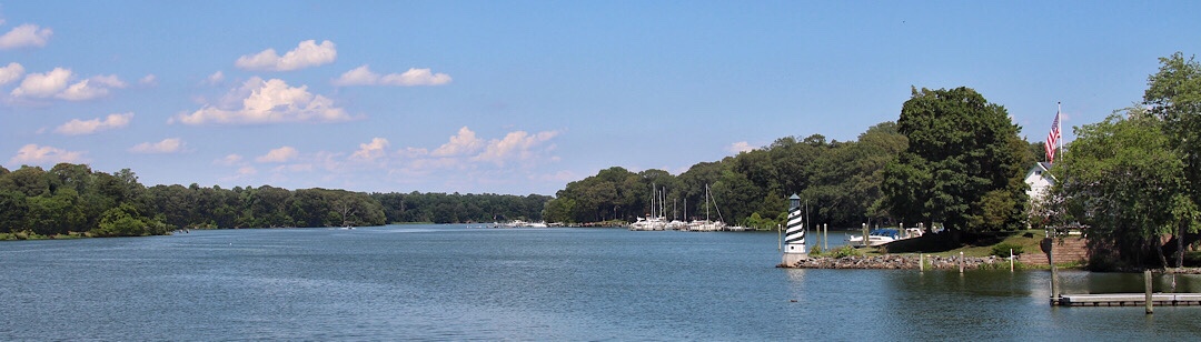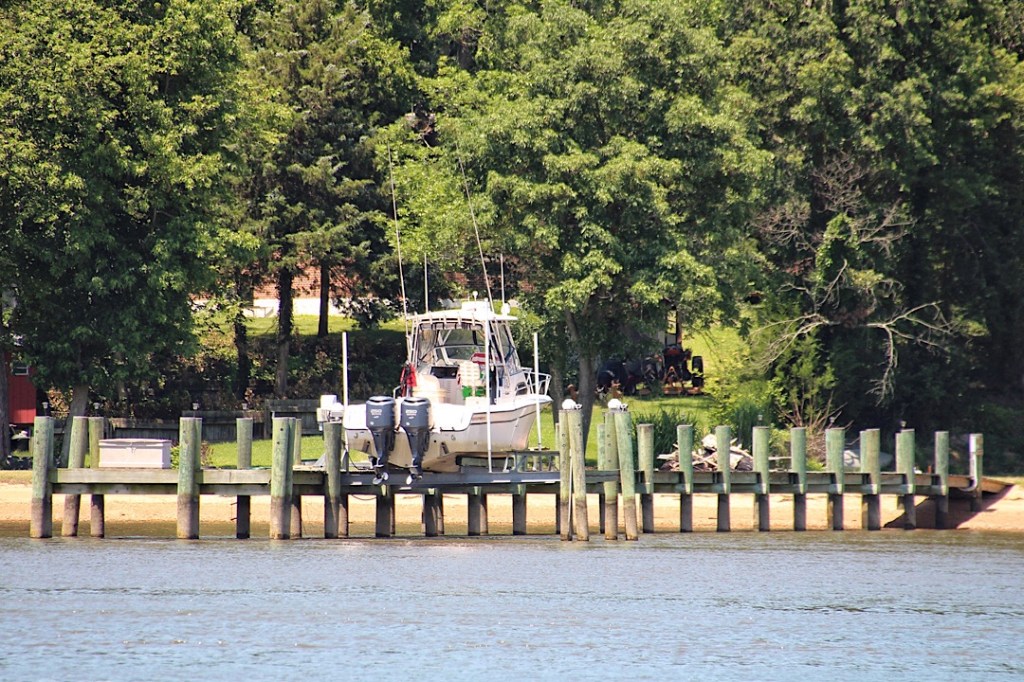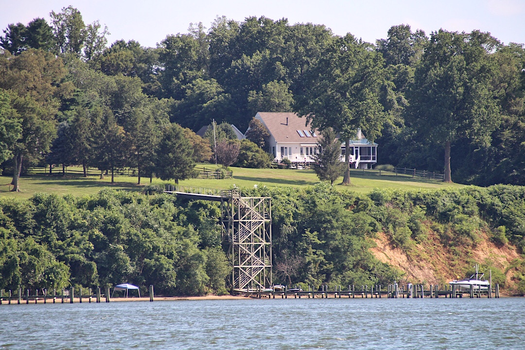 Als nächstes Ziel haben wir uns Georgetown ausgewählt. Dafür segeln wir ein Stück weiter die Chesapeake Bay hinauf und dann gut 8 sm weit in den wunderschönen Sassafras River hinein. Wir sind schier überwältigt von diesem für uns bisher schönsten Fluss hier. Der Sassafras schlängelt sich, mal schmal, mal breiter, zwischen einer leicht hügeligen Landschaft hindurch, die mit lehmigen Steilufern, flachen Sandstränden, dichtem Schilf, riesigen Seerosenbuchten, gelegentlichen Wiesen oder Feldern und viel Wald herrlich abwechslungsreich ist. Die Bebauung ist hier am „Eastern Shore“ bei weitem nicht mehr so dicht wie um Annapolis herum oder am Magothy River. Wenn die Häuser höher am Hang gebaut sind, wird der Wasserzugang über Treppenkonstruktionen erschlossen oder es gibt einen eigenen Freisitz über dem Privatsteg.
