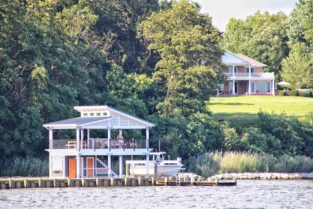 Vor dem flachen Uferbereich ziehen sich lange Stege der versteckt unter den Bäumen liegenden Häuser hinaus. Manchmal mit Bootshäusern, fast immer aber mit Bootsliften versehen. Insbesondere die Motorboote werden hier zumeist nicht am Steg vertäut, sondern mit dem heimischen Bootslift elektrisch komplett aus dem Wasser gehoben und „in der Luft“ geparkt. Spart vielleicht auch das Antifouling. ☺️ In Marinas gibt es häufig überdachte Hallen für die Motorboote im Wasser, manchmal auch regelrechte Hochregallager, mehrstöckige Stapelplätze an Land.
