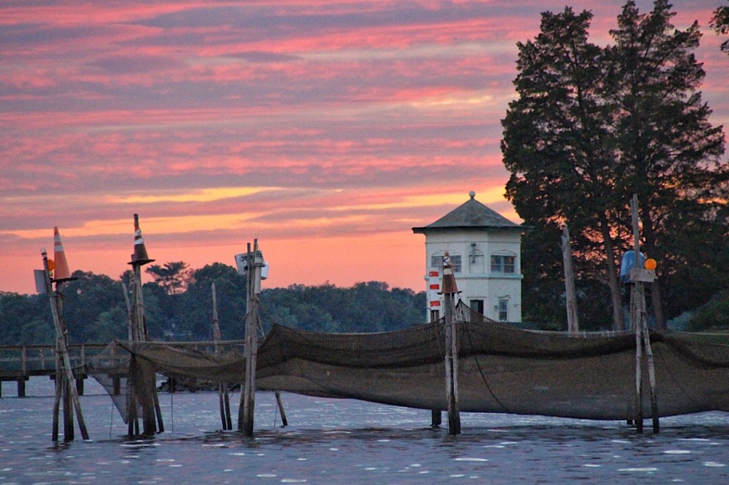 Aber es gibt nicht nur solche Luxusvillen, sondern auch schöne einfache Häuser am Ufer. Insgesamt erinnert die Landschaft uns vielfach an unser altes Heimatrevier Schlei, kein Wunder, dass es uns so gut gefällt. Noch dazu, wenn wir vom Ankerplatz aus einen solchen Sonnenuntergangsblick genießen dürfen:
