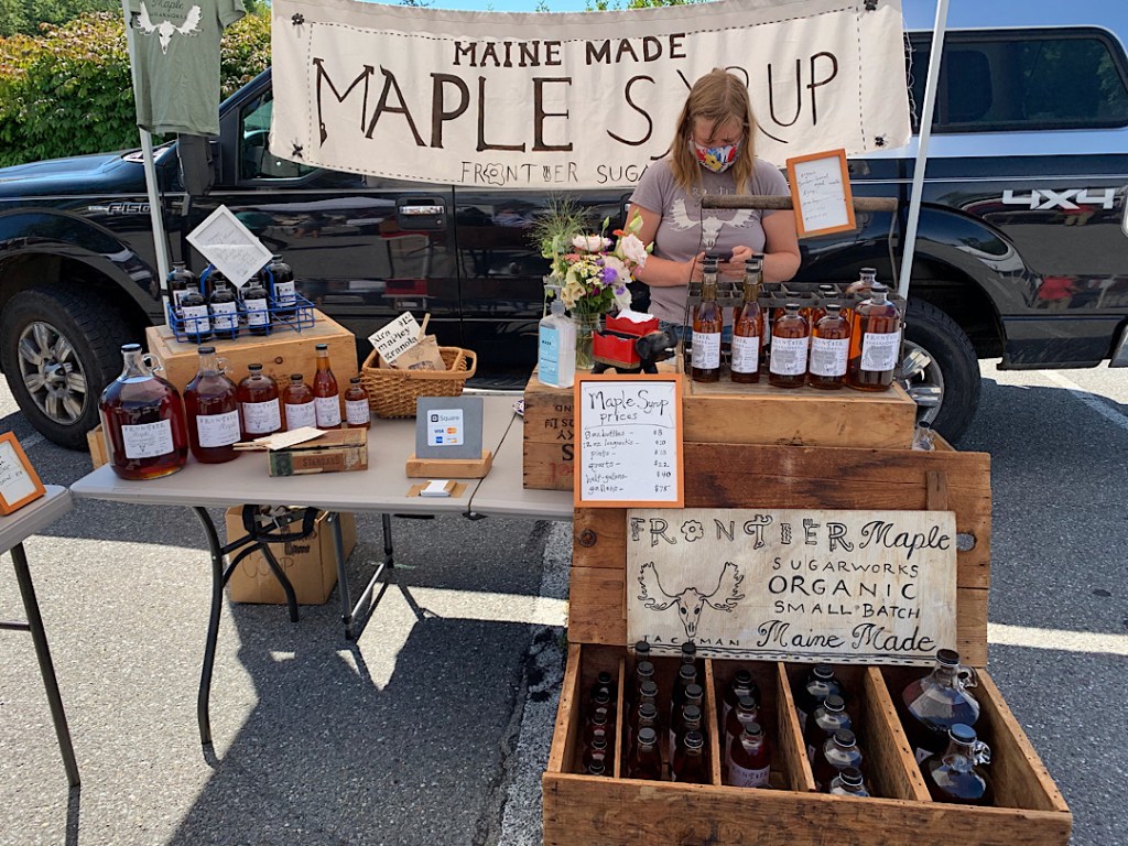 Schön, dass heute die Sonne gewonnen hat (ist hier wohl nicht immer so 😉). Wir schnappen uns das Dinghy und fahren an Land, denn heute ist Farmers Market, also eine gute Chance für uns auf Wildheidelbeeren aus Maine, die wir im Supermarkt leider nicht bekommen. Die von Jill in Boothbay Harbor geschenkten Heidelbeeren haben uns verwöhnt und angefixt, seitdem sind wir auf der Suche nach den kleinen aber intensiv schmeckenden Blaubeeren. Und tatsächlich, wir müssen zwar dafür einmal quer durch den Ort aber es lohnt sich, wir finden nicht nur die Wildblaubeeren, sondern auch noch weitere lokale Köstlichkeiten wie etwa hausgemachten Ahornsirup.