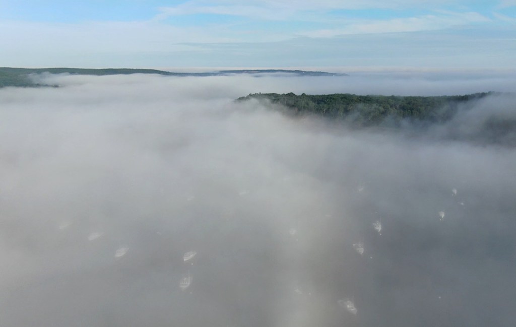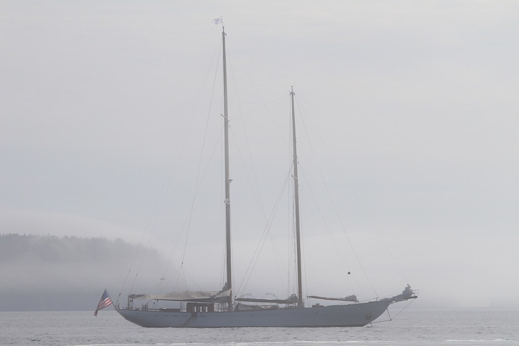 Sicher an der Boje liegend ist das ein faszinierender Anblick, aber jetzt durch die dichten Felder der Lobsterpots motoren zu müssen möchte ich mir lieber nicht vorstellen. Anfangs kann ich kaum das Boot an der Nachbarmooring ausmachen, das gestern Abend noch zum Anfassen nahe schien. Aber dann setzt sich gaaaaanz langsam die Sonne immer mehr durch, brennt erste kleine Löcher in die graue Suppe, lässt manchmal schon den blauen Himmel über den vielen Booten in der Nebelbank erahnen.