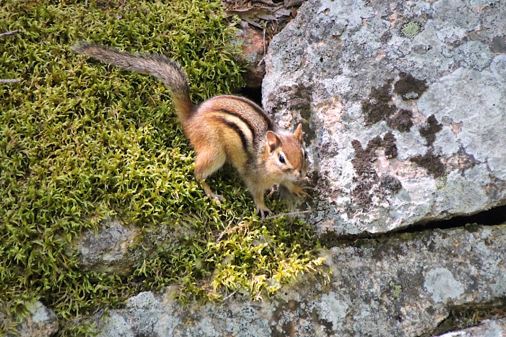 Und nicht nur die Landschaft gefällt uns gut. Die rund 23 Grad, die wir hier im Moment tagsüber so haben, machen die durchaus anstrengende Tour gut erträglich. Neben den vielen malerischen Ausblicken sorgen Streifen-Backenhörnchen für zusätzliche Kurzweil, immer wieder flitzen sie über den Weg, bleiben dann manchmal am Rand sitzen und scheinen uns so zu beobachten wie wir sie: