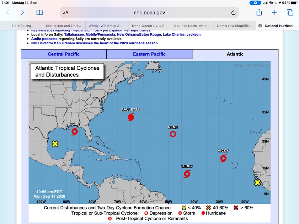 Morgen soll es mal wieder einen Ortswechsel geben, wir möchten nach New Bedford am Festland. Das hängt damit zusammen, dass New Bedford ebenfalls eine schöne alte Walfängerstadt sein soll, aber auch damit, dass der Hurrikan „Paulette“ heute Nacht bereits Bermuda erreichen soll, laut Prognose wird er dann weiter nach Nordosten ziehen. Damit trifft er zwar nicht auf die US-Ostküste, zieht aber mit einigem Abstand an ihr hoch, bringt das Wetter durcheinander und wahrscheinlich auch ziemlich hohe Wellen. Da suchen wir lieber ein bisschen Schutz am Festland hinter den vorgelagerten Inseln. Mit Rene (der sich weiter draußen auf dem Atlantik bereits zur Depression abgeschwächt hat) und dem tropischen Sturm Sally an der Westküste Floridas ist auch sonst einiges los. Nur noch für drei weitere benannte tropische Stürme reichen die Namen (Teddy, Vicky und Wilfred, die Buchstaben Q, U, X, Y und Z werden als Anfangsbuchstaben der Namen nicht verwendet), alle weiteren benannten tropischen Stürme in diesem Jahr bekommen dann griechische Buchstaben (Alpha, Beta, Gamma …) Muss eigentlich nicht sein 😬. Nachtrag: jetzt, nur ein paar Stunden später sind auch Teddy und Vicky bereits benannte Stürme!)