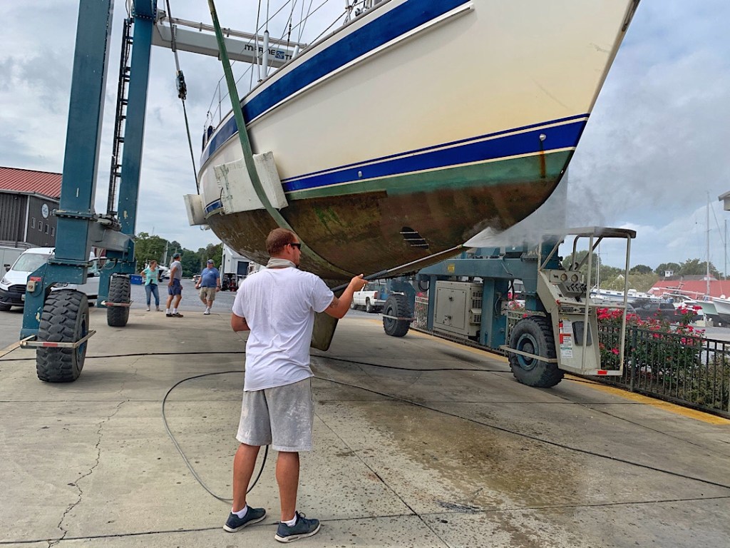 Aber zunächst mal sind wir leicht nervös, wie unser Unterwasserschiff aussehen wird. Das in Griechenland aufgebrachte Coppercoat hat sich im Mittelmeer super bewährt, in der Karibik fanden wir es o.k., wobei ich dort im klaren Wasser schnorchelnd oder tauchen häufiger mal mit einem Glitzi-Schwamm den leichten Bewuchs abgewischt habe. Das ist in den letzten vier Monaten nicht mehr passiert und die Chesapeake Bay mit ihrem warmen braunen Wasser ist für ihren schnellen Bewuchs gefürchtet. Das ich zwischendurch mal schwimmend von der Wasseroberfläche aus (soweit man mit dem Arm eben kommt) den sich wie 2 mm starker Rollrasen lösenden Teppich mit dem Eiskratzer abgeschabte habe hat unsere Befürchtungen nicht gemindert. Außerdem ist unklar, wie das kältere aber nährstoffreiche Wasser in Neuengland und der Wechsel zurück ins Brackwasser der Chesapeake Bay sich ausgewirkt haben.