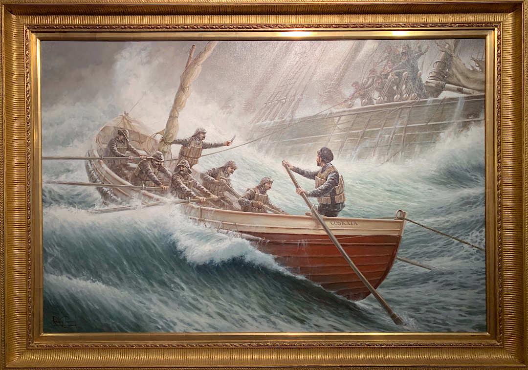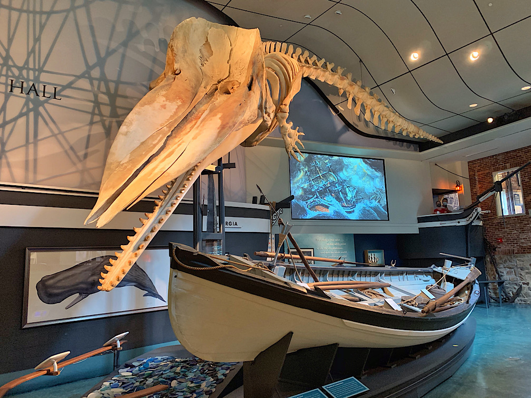 Beeindruckt sind wir auch von dem detailreichen Panoramabild, das Walfangschiffe aus New Bedford bei ihrer Reise um die Welt und die Eindrücke ihrer Besatzung stimmungsvoll einfängt. Dabei ist das lange und schmale, in vier übereinander angeordneten Bahnen angeordnete Gemälde nur eine Kopie im Maßstab 1:12. Das inzwischen restaurierte Original des 1848 erstellten “Grand Panorama of a Whaling Voyage ‘Round the World” ist 388 m lang und 2,5 m hoch! Das Museum denkt noch darüber nach, wie das Originalgemälde präsentiert werden kann.