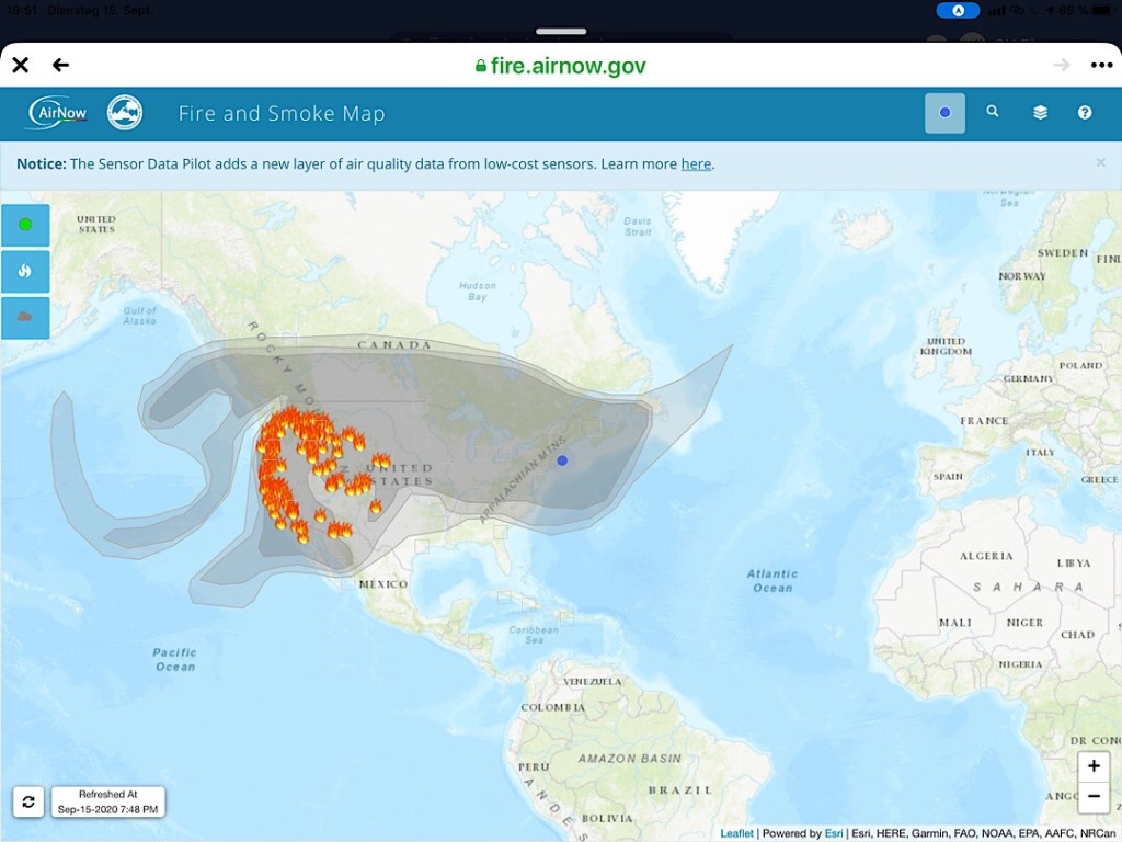 Schon über 30 Tote haben die Brände gefordert, viele Menschen werden noch vermisst, da scheint ein bisschen Rauch, selbst weit entfernt auftretend, nicht dramatisch. Ist es vielleicht auch nicht. Andererseits: aktuell ist die Luftqualität in Portland in Oregon an der US-Westküste (dort, wo besonders starke Brände wüten) derzeit die schlechteste auf der Erde! Spätfolgen?