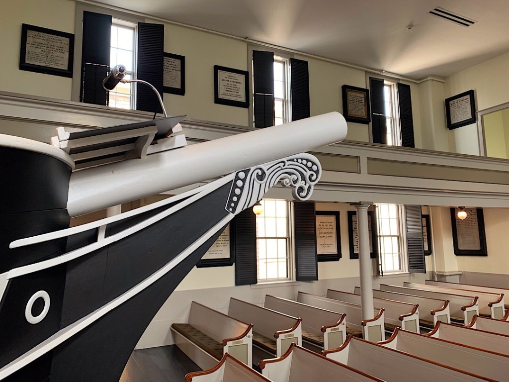 Direkt in der Nähe liegen dann auch noch das 1787 gebaute historische Seemannsheim (heute Museum) und die konfessionsfreie “Seaman’s Bethel” von 1832, die Kirche, die mit ihren Erinnerungstafeln an der Wand für die auf See gebliebenen und dem eindrucksvoll und in der Sprache der Walfänger predigenden Seemannspfarrer den jungen Herman Melville inspiriert hat und dann auch in Moby-Dick verewigt wurde.
