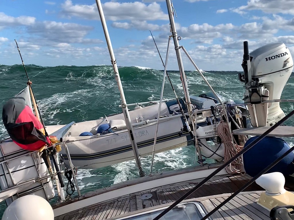 Allerdings legt der Wind ab der zweiten Wache dann wieder ordentlich zu, immer mal wieder Böen von 8 Beaufort, wir reffen die Fock beim Wachwechsel auch noch ein und rauschen weiter. Am zweiten Vormittag nimmt der Wind noch ein bisschen weiter zu, statt 35 kn in den Böen werden es in der Spitze nun knapp unter 40. Stürmischer Wind knapp unter Sturmstärke, aber eben von achtern und damit beim Scheinbaren Wind um unsere Geschwindigkeit von rund 8 kn geringer. Flora verhält sich klasse und rutscht gelegentlich von den Wellen angeschoben in deutlich zweistellige Geschwindigkeitsbereiche, wenn auch immer nur kurz. Dabei bleibt sie trotz der inzwischen bestimmt 2,5 m hohen Wellen immer sicher beherrschbar. Macht sogar Spaß, zumal keinen von uns die Seekrankheit erwischt!