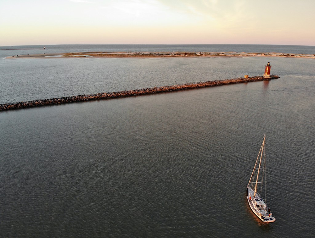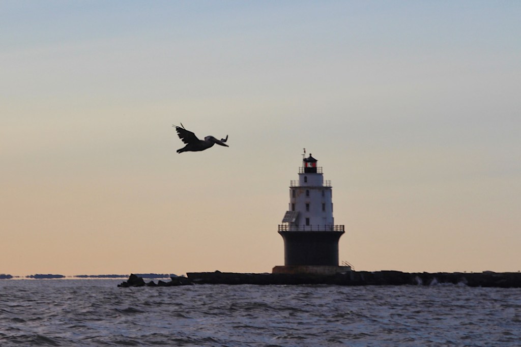 Und das flotte Vorankommen sichert uns dann tatsächlich auch ein Ankommen bei Tageslicht, obwohl der Wind dankenswerterweise vor der mit Flachs gespickten Mündung des Delaware fast ganz einschläft. Mit mehr als einer Stunde „Puffer“ fahren wir auf den Leuchtturm „Harbor of Refuge Light“ zu, erstmals seit langem wieder begrüßt von Delfinen und Pelikanen.