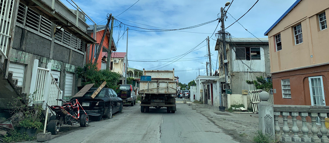 In der Oyster Pond Marina im Osten kurz vor der französischen Grenze liegen ein paar Yachten zwischen versunkenen und zerstörten Stegen, der Hotelkomplex auf der schützenden Halbinsel hat auch schon deutlich bessere Zeiten gesehen.