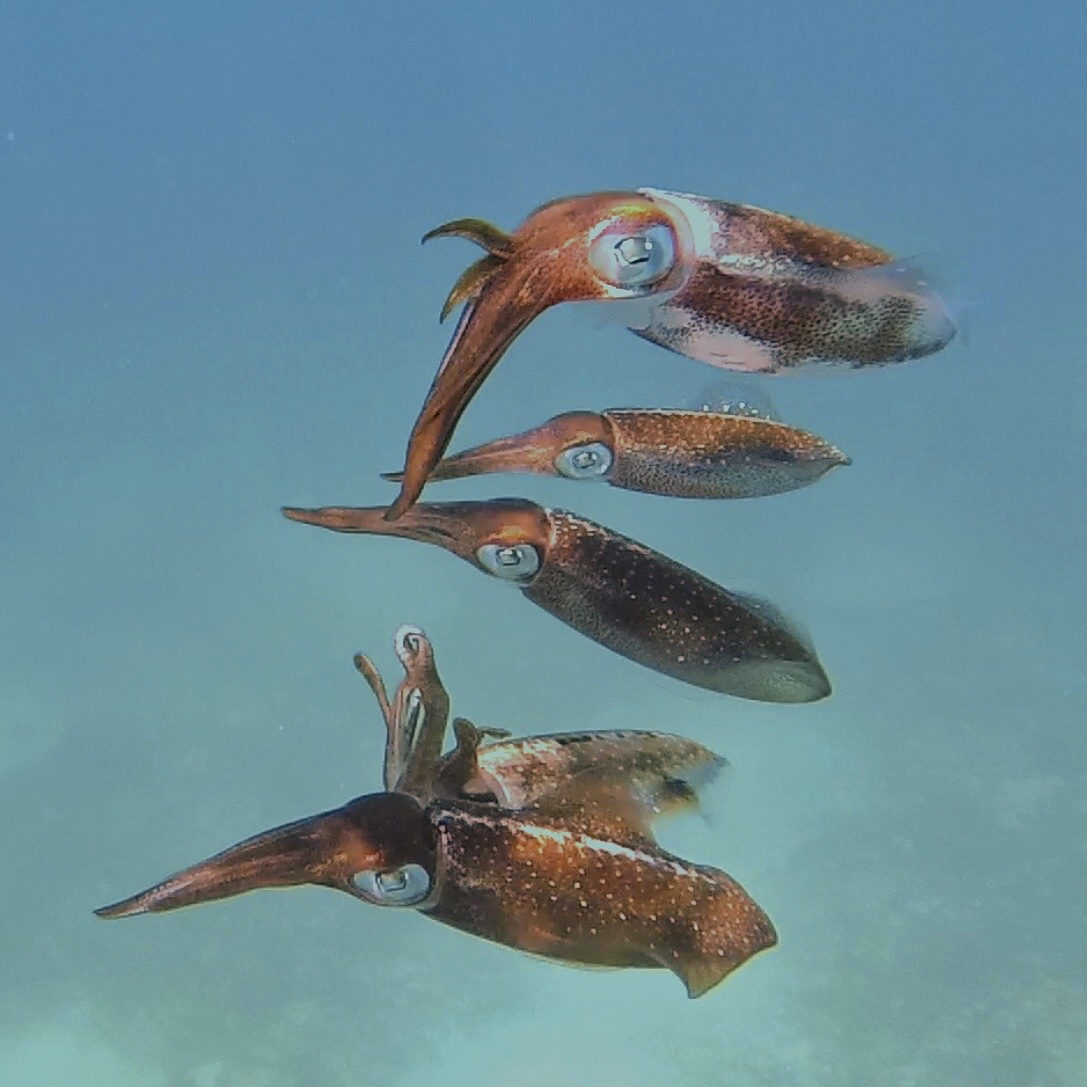 Sepien oder (worauf wir tippen) vielleicht eher karibische Riffkalmare geben sich ein farbwechselndes Stelldichein an der Bojenleine und lassen uns erstaunlich nahe herankommen um sie zu beobachten. Das haben wir so noch nie erlebt.