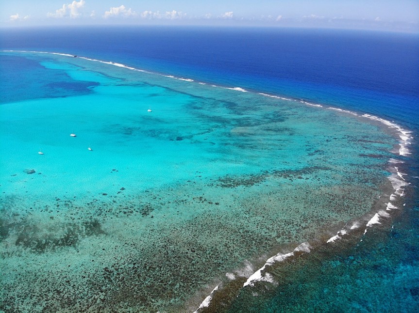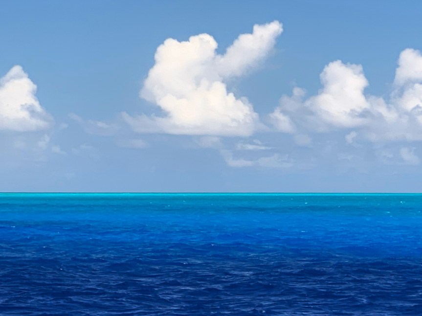 Nun motoren wir genau gegen den Wind durch das türkisfarbene Wasser der Lagune, das wir beim Näherkommen als unwirklich fast künstlich leutend türkisen Strich in dem dunklen Blau des umgebenden kilometertiefen Meeres ausmachen konnten.