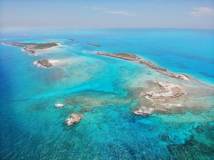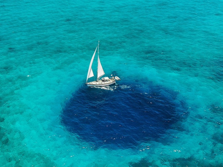 (Südsüdost nach Nordnordwest), wir können unter Segeln auch die letzte Meile nach Jamaica Cay hochsegeln. Und die Strecke birgt noch ein Highlight: Direkt vor Jamaica Cay liegt ein Blue Hole im Meer. Anders als noch auf Raccoon Cay, wo es sich eher als grünes Auge auf der Insel präsentierte, ist das Blue Hole hier von etwa 5 m tiefem Wasser umgeben. Wiederum kreisrund fällt die Wand des Loches steil auf knapp dreißig Meter Tiefe ab, der Durchmesser beträgt nur etwas mehr als zwei Schiffslängen. Aus der türkisen Umgebung schimmert es beim Heransegeln tiefblau heraus. Und natürlich lassen wir uns die Chance nicht entgehen, direkt darüber hinweg zu segeln. Es ist ein ganz besonderer Moment. Und obwohl es ja diverse Blue Holes in den Bahamas gibt, eignen sich auch bei weitem nicht alle dafür. Viele haben einen flachen Riffrand aus Korallen. Toll zum Schnorcheln, aber weniger gut zum drüberfahren.
