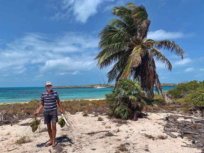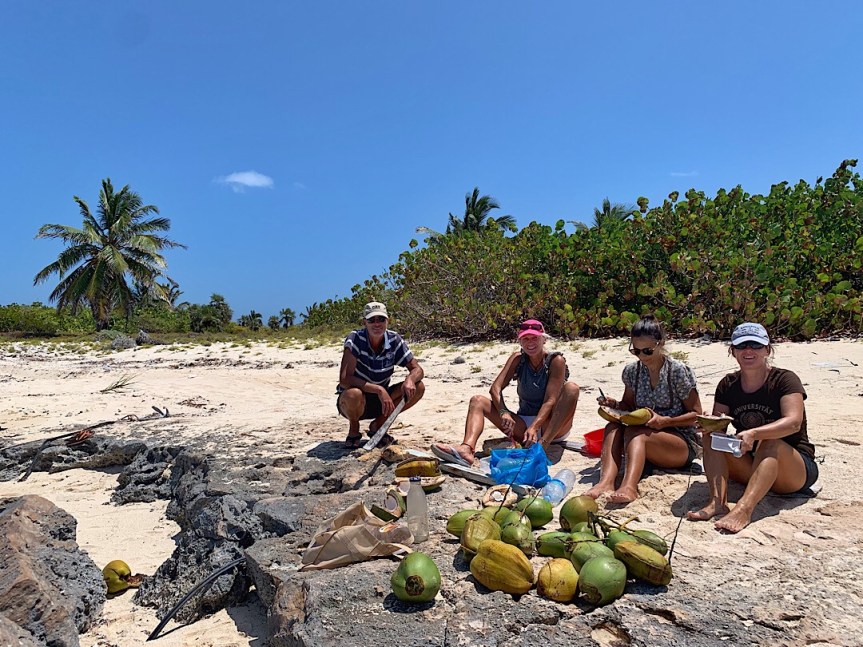 Jamaica Cay ist unbewohnt, der Versuch hier ein kleines Resort zu errichten schon vor Jahren gescheitert, wie die Ruinen der Gebäude und die beiden weithin sichtbaren Tanklastzugauflieger traurig bezeugen. Der positive Effekt ist, dass es einige Kokospalmen gibt. Viele heruntergefallene Nüsse liegen am Boden, aber mit denen können wir natürlich nichts mehr anfangen. Zum Klettern auf die Bäume sind wird definitiv nicht geschickt genug. Wir entwickeln verschiedene Techniken um trotzdem an die Nüsse heranzukommen (Abschlagen mit einem langen Holz, Räuberleiter und Macheteneinsatz, Heraufwerfen eines Seiles und Abziehen der Kokosnüsse), es klappt gut. Und dann erarbeiten wir uns das Innere der Nüsse. Je nach Reifegrad der Kokosnüsse „ernten“ wir Kokoswasser und/oder weiches, mittelhartes oder hartes Kokosfleisch. Ein Fest für Cocktails und Küche.