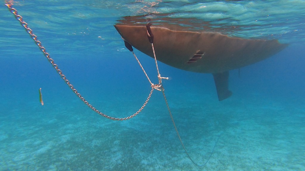Aber: das freie Ankern führt hier gelegentlich zu befremdlich anmutenden Positionen von Anker und Ankerkette relativ zum Boot.