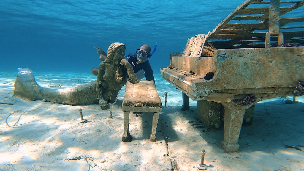 Nahe an unserem Ankerplatz vor Rudder Cut Cay, einer der Privatinseln des Illusionisten David Copperfield, hat der Magier die Statue eines Konzernflügels in Originalgröße mit einer an die Klavierbank gelehnten Meerjungfrau versenken lassen, etwa vier Meter ist das Wasser hier tief. Ein wirklich bezaubernder Schnorchelspot 😉. Als wir unser Dinghy daneben verankert haben und mit Tauchflossen hinüber schwimmen wollen, kommen wir kaum gegen die Strömung an, es ist wirklich anstrengend. Ein Ausflugsboot kommt dazu, drei Touristen ohne Flossen springen ins Wasser und wollen zur Meerjungfrau hinuntertauchen, werden aber einfach an der Statue vorbeigetrieben. Das Ausflugsboot sammelt sie ein Stückchen weiter wieder ein.