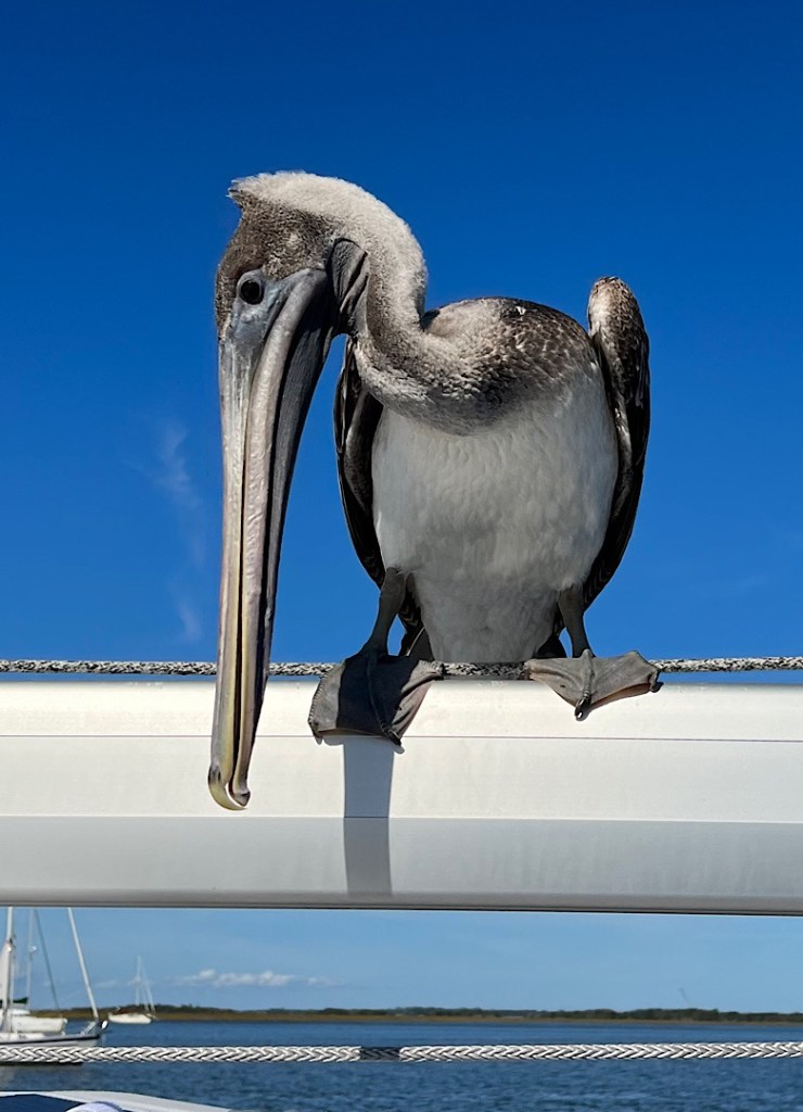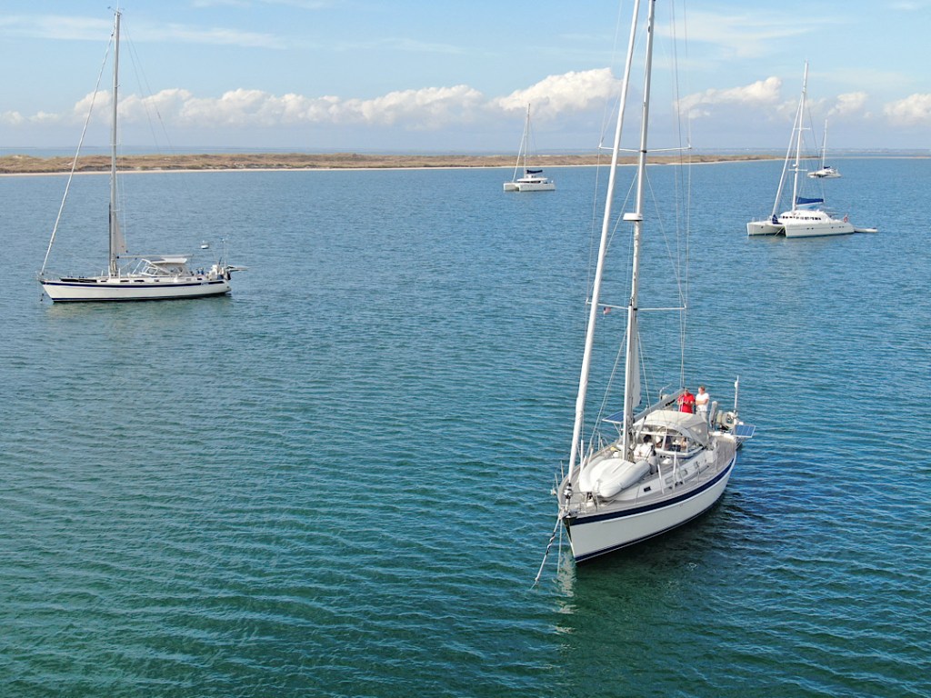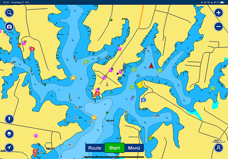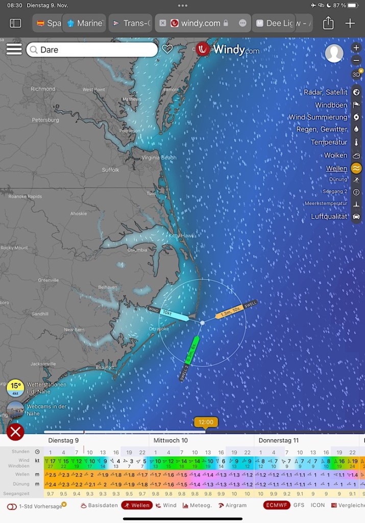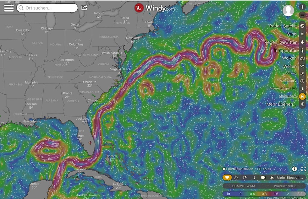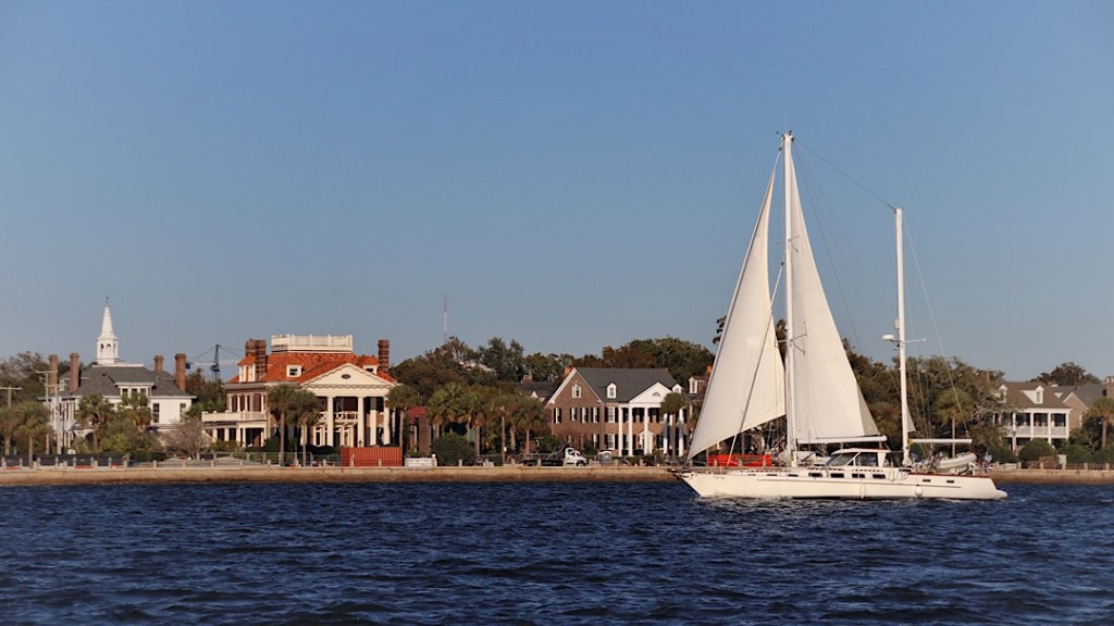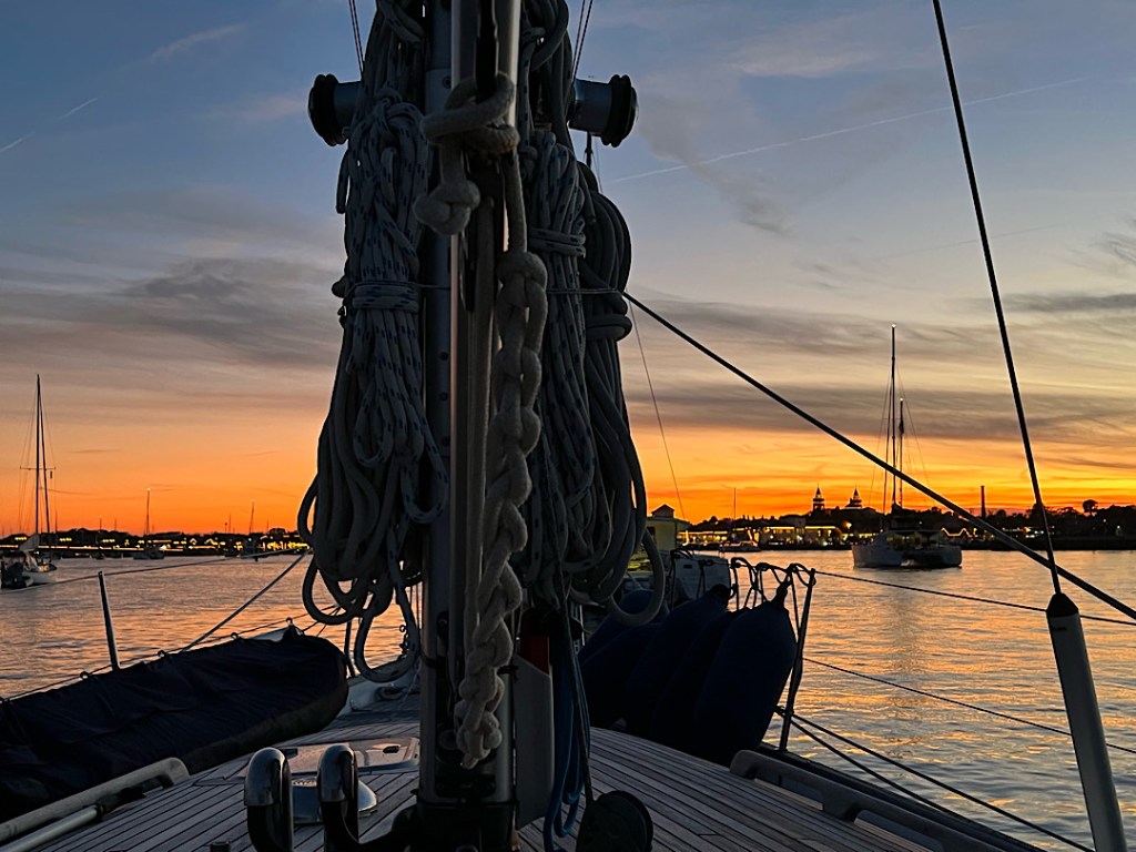 Die Einfahrt nach St. Augustine hat einen Ruf. Wir werden vorher von anderen Seglern gefragt, ob wir da wirklich rein wollen. Man habe Schlimmes gehört. Und die Navionics-Seekarte zeigt direkt vor der Einfahrt die Zweimeter-Linie an. Hm. Aber auf Sonar-Charts umgestellt wird klar, dass die Tiefe mehr als ausreichend ist. Die Recherche zeigt außerdem, dass der schlechte Ruf von Wind-gegen-Strom-Situationen herrührt. Wir timen es so, dass uns das nicht trifft. Tatsächlich ist es dann völlig unproblematisch und wir finden auch noch einen Platz im gut gefüllten Ankerfeld vor der alten Festung der Stadt.