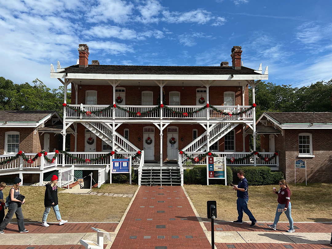 Ein anderer (ziemlich langer) Spaziergang führt uns am nächsten Tag zum Leuchtturm von St. Augustine auf einer Insel jenseits des ICW. Es ist der erste Advent und nicht nur das Geländer der Aussichtsplattform des charakteristisch spiralförmig schwarz-weiß geringelten Leuchtturm mit seiner roten Haube ist weihnachtlich geschmückt.