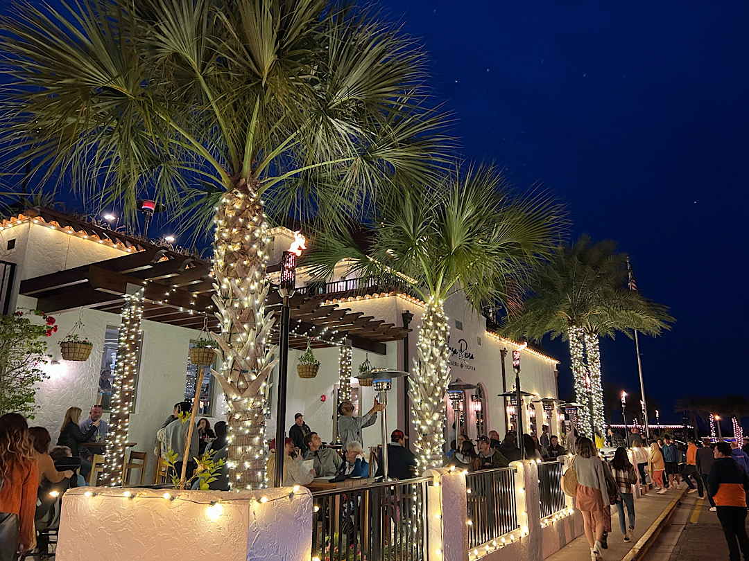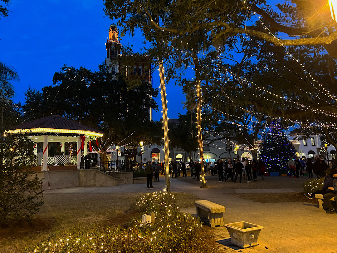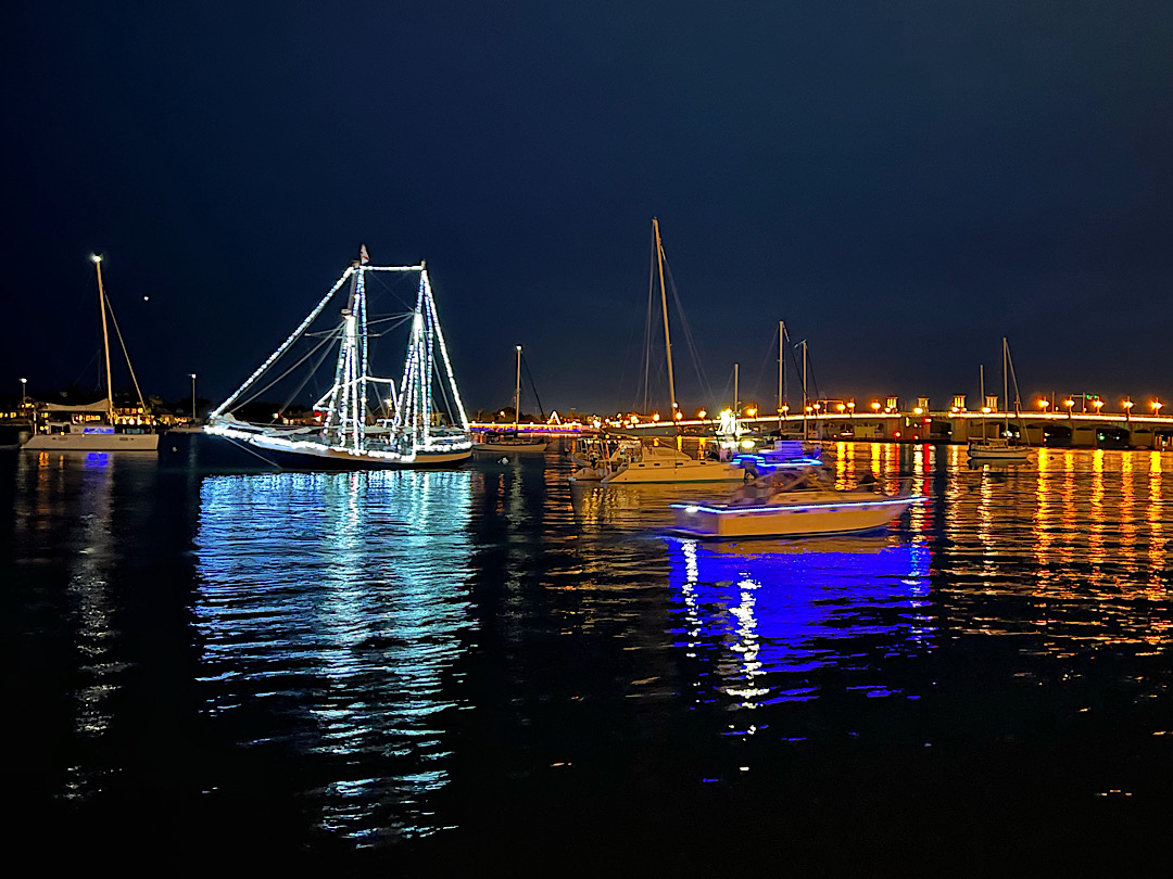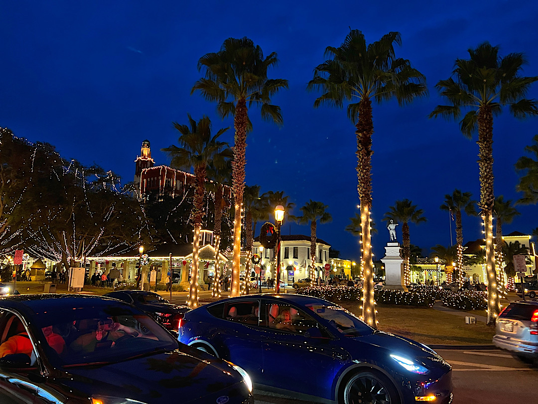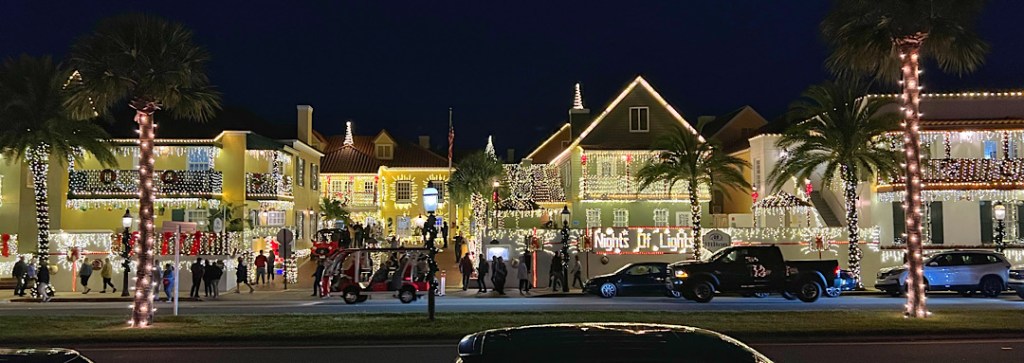 Nights Of Lights. Schon seit 28 Jahren wird in St. Augustine unter diesem Namen in den Wintermonaten eine Illumination privater und öffentlicher Gebäude vorgenommen, bei der die besten Beleuchtungen am Ende prämiert werden. Das ganze hat hat sich zu einem Touristenmagnet entwickelt, kaum einer mag zurückstehen. Auch die Schiffe werden mit Glühbirnen vollgehängt und wir sehen sogar Pferdekutschen mit „Unterboden-Beleuchtung“. American Show, die auf der offiziellen Webseite der Stadt ohne erkennbaren Anflug von Ironie auf den alten spanischen Brauch zurückgeführt wird, zu Weihnachten eine weiße Kerze ins Fenster zu stellen, um in den Häusern und Herzen symbolisch Raum für Jesus zu schaffen.