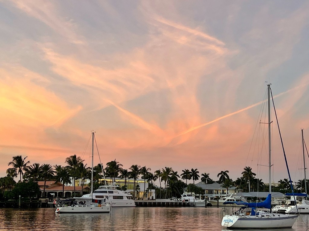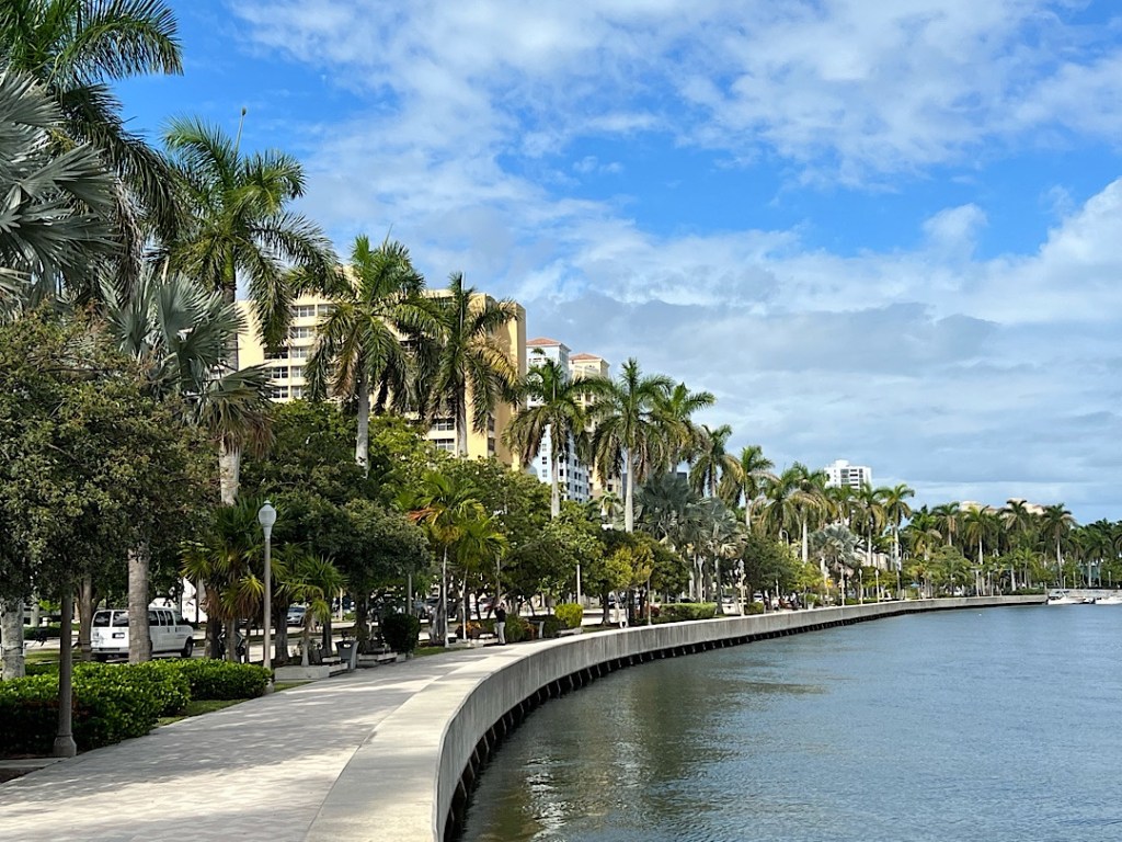 Palm Beach begrüßt uns mit Hochhäusern, Industriehafen und Superyachten, aber der Ankerplatz im Lake Worth zeigt auch die schöne Seite der Stadt. Vom (allerdings eine lange Dhinghyfahrt entfernten) städtischen und damit kostenlosen Dinghydock führt eine palmengesäumte Promenade am Ufer entlang.